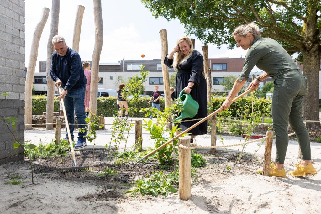 De eerste bloemen staan intussen in bloei, leerkrachten zetten kruidenthee uit eigen schooltuin en de hele dag door spelen er kinderen op het schoolplein. “Het is er altijd druk, ook in het weekend”, vertelt Lucy, wier drie kinderen op de Andersenschool zitten. Ze stapte in september 2023 naar de leiding van de school met haar plan voor een groen schoolplein. “Dat werd enthousiast ontvangen, want de wens om iets aan het schoolplein te doen lag er al langer.”